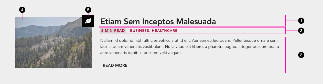 <x-preview title="Etiam Sem Inceptos Malesuada" h_level="4" icon="cloud"> <x-slot name="image"> <img class='tux-c-preview__image' src='/wp-content/themes/tux-wp/public/images/hero-background-lg.jpg'> </x-slot> <x-slot name="byline"> <span class="highlight highlight-accent">5 Min Read</span> <span class="highlight">Business, Healthcare</span> </x-slot> <p>Nullam id dolor id nibh ultricies vehicula ut id elit. Aenean eu leo quam. Pellentesque ornare sem lacinia quam venenatis vestibulum. Nulla vitae elit libero, a pharetra augue. Integer posuere erat a ante venenatis dapibus posuere velit aliquet.</p> <x-button href="http://example.com" class="tux-c-button--narrow">Read More</x-button> </x-preview>