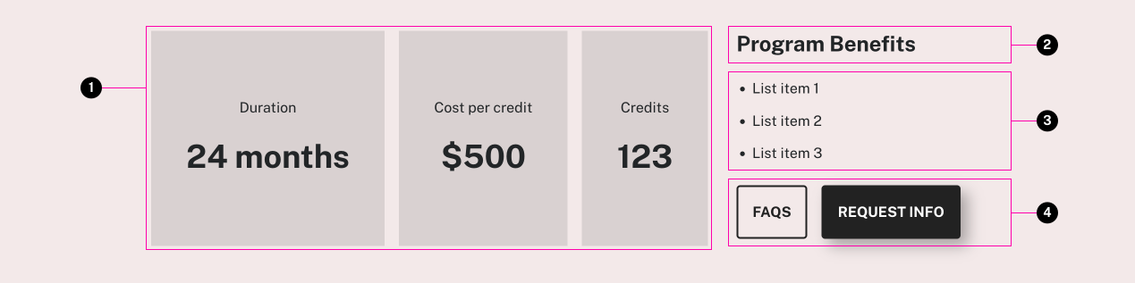 - Be mindful of character count. Less is more to retain the design aesthetic of the component. Each bullet should be ~ 60-65 characters (including spaces) and the entire real estate (all bullets considered) should not exceed 200 characters (including spaces)