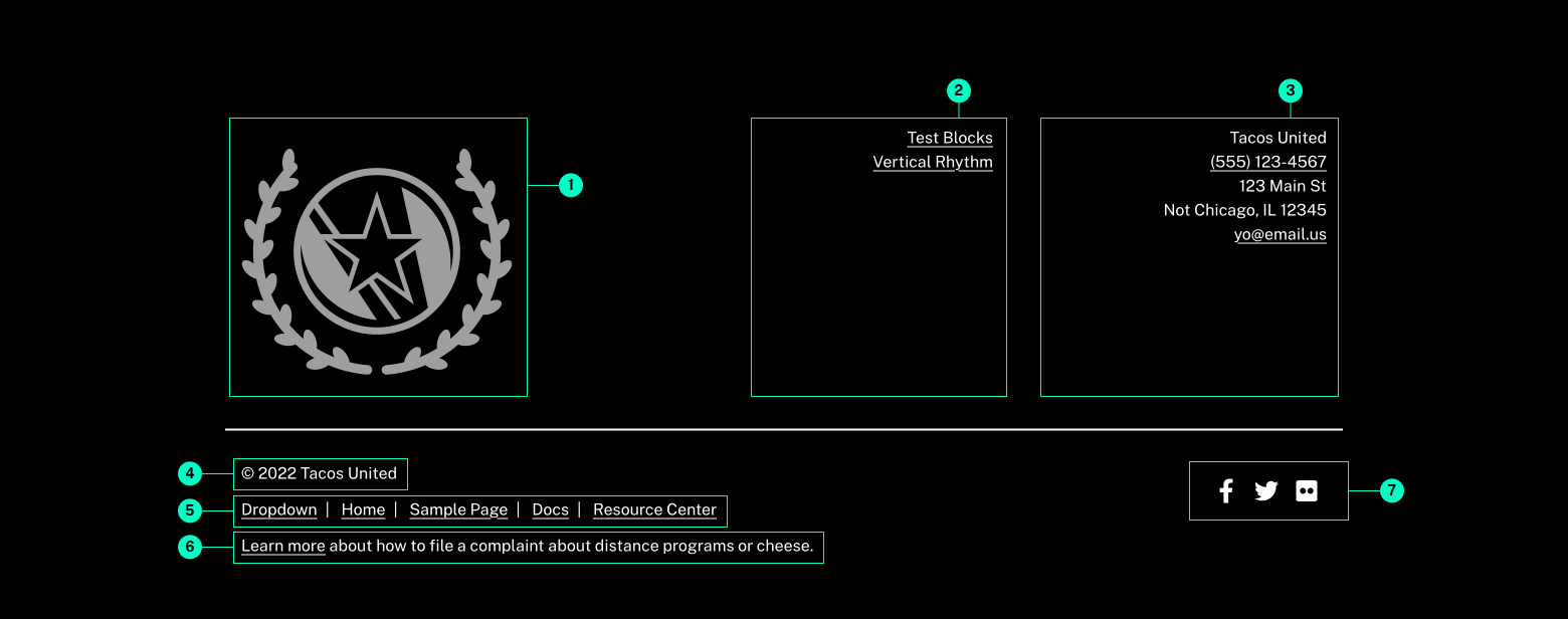| footer_text_align | string | applies utility class to align contact info and menu on medium breakpoint and up Allowed Values: "left", "center", "right" | No | false |
