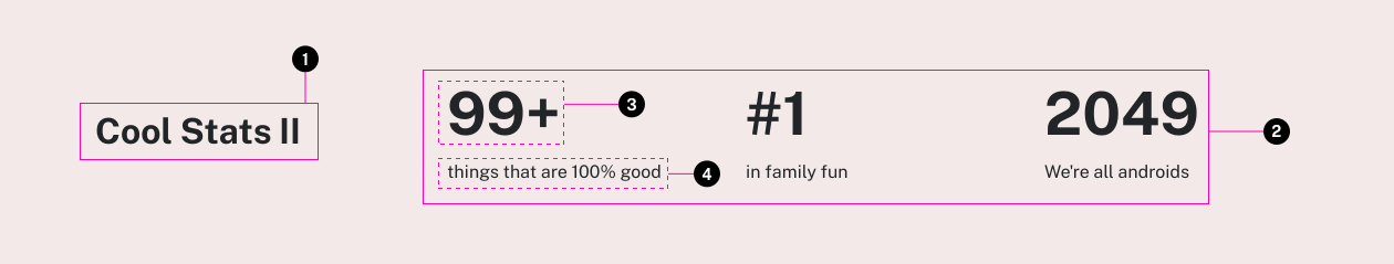 Stats are handy when promoting several related data points. Stats can have a maximum of three items listed. If more are needed, consider using individual fact components arranged in a grid.