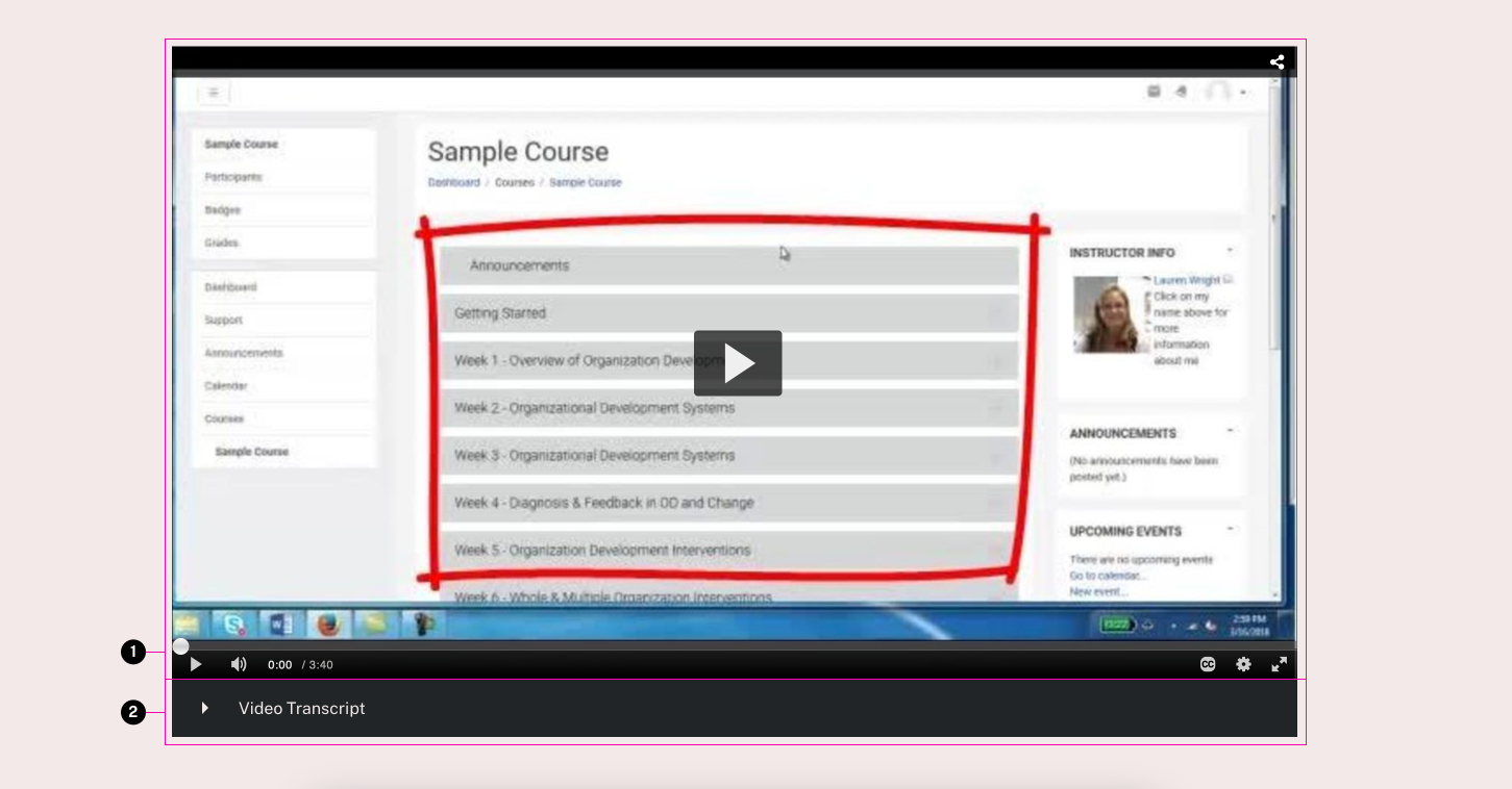 Videos can be placed in-page next to other content, or within a modal dialog window component. If a transcript is provided, it will be output in an accordion component underneath the embed container for the video.